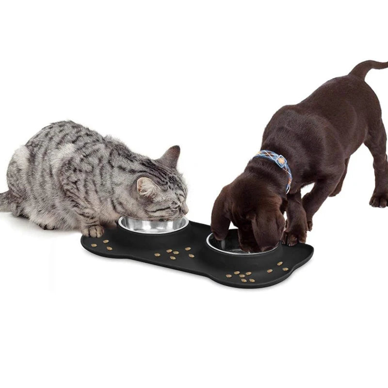 - Dual bowls in a stainless steel design sit in a silicone anti-spill cradle, helping you tame splashes and puddles during feeding.